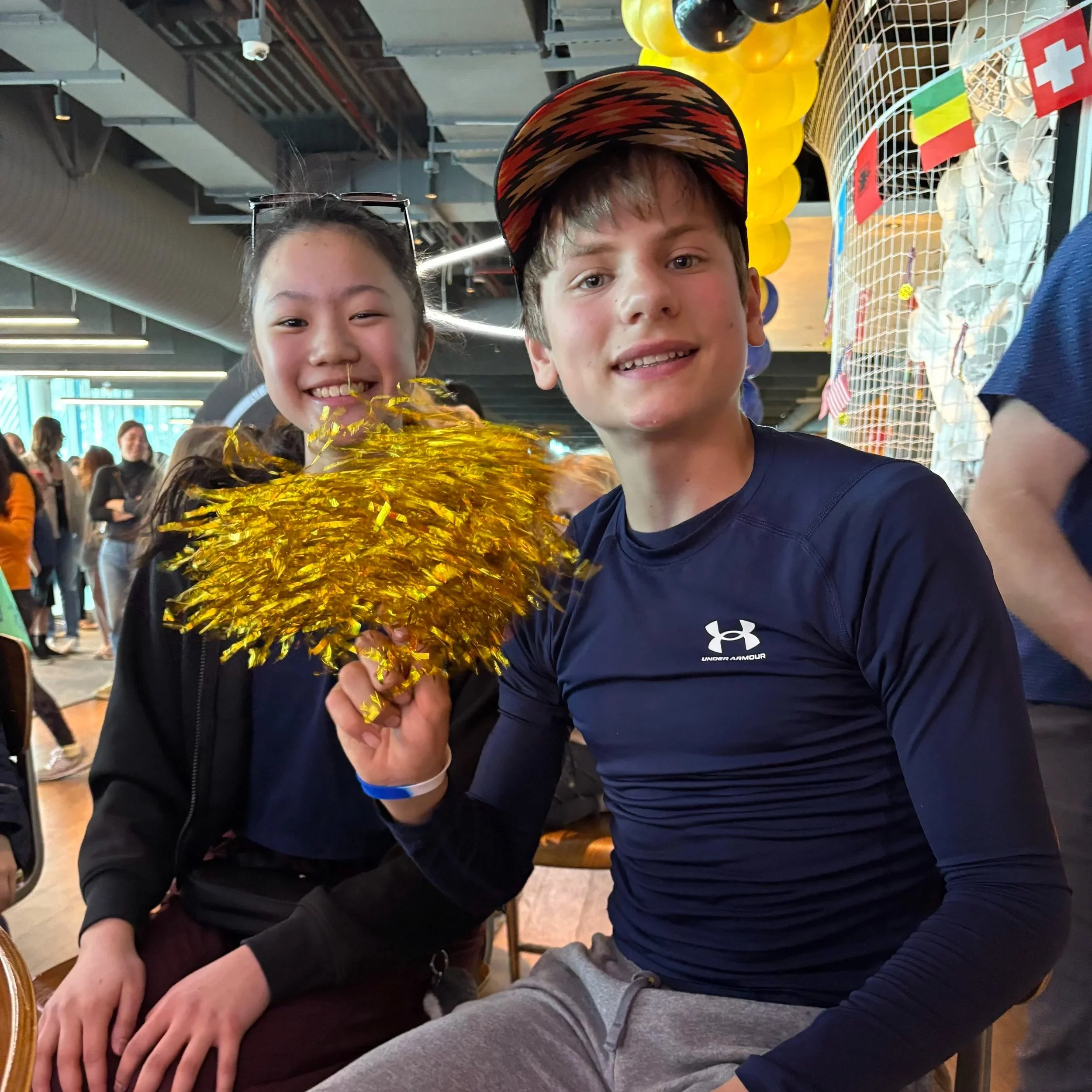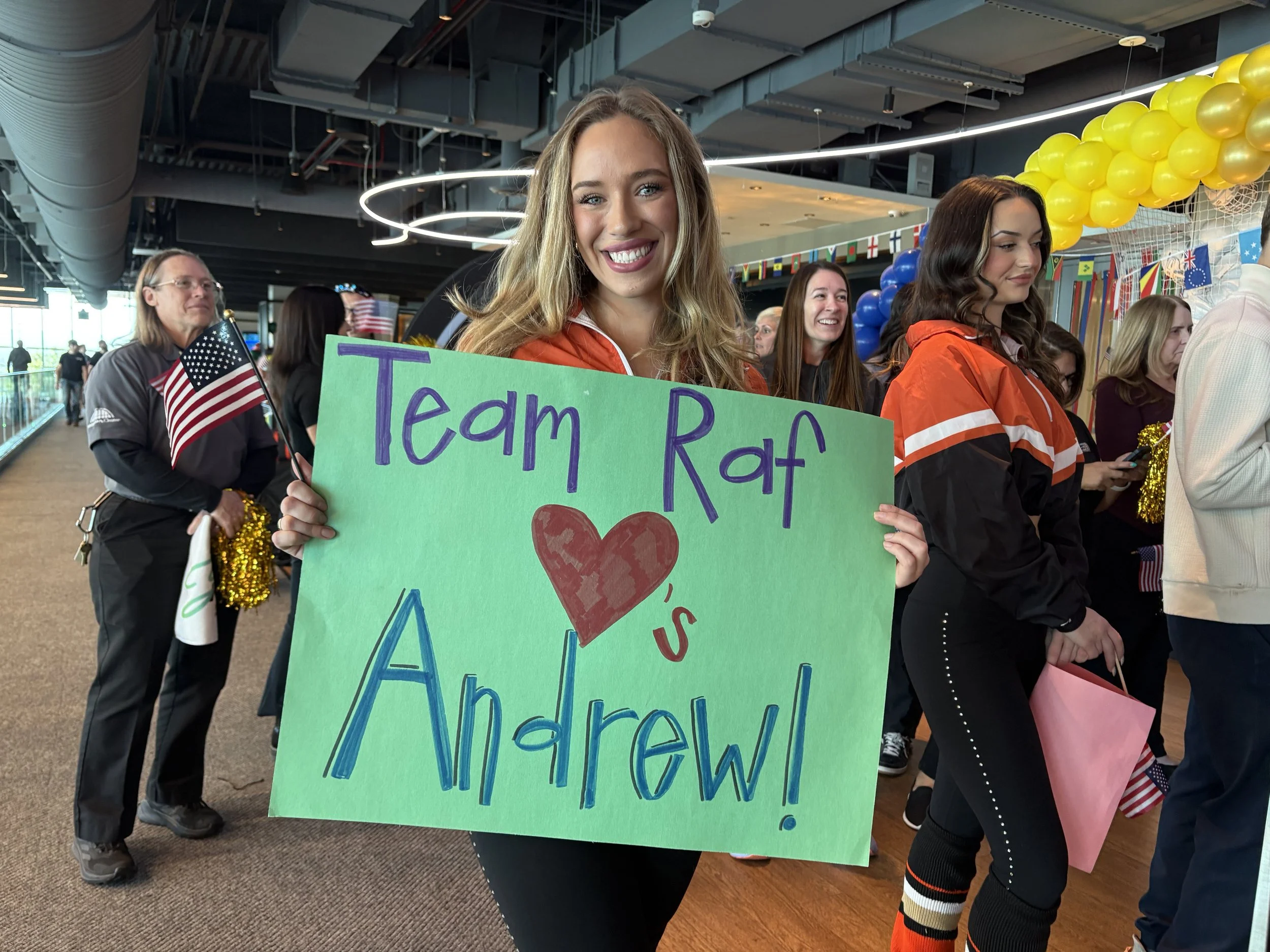 At noon on Friday, February 13, a boisterous crowd gathered beneath balloons and streamers. American flags waved. Handmade signs bobbed above heads. Gold pom-poms shimmered in the air. The watch party felt less like a viewing event and more like a family reunion where the relatives just happen to be competing on the Olympic stage.